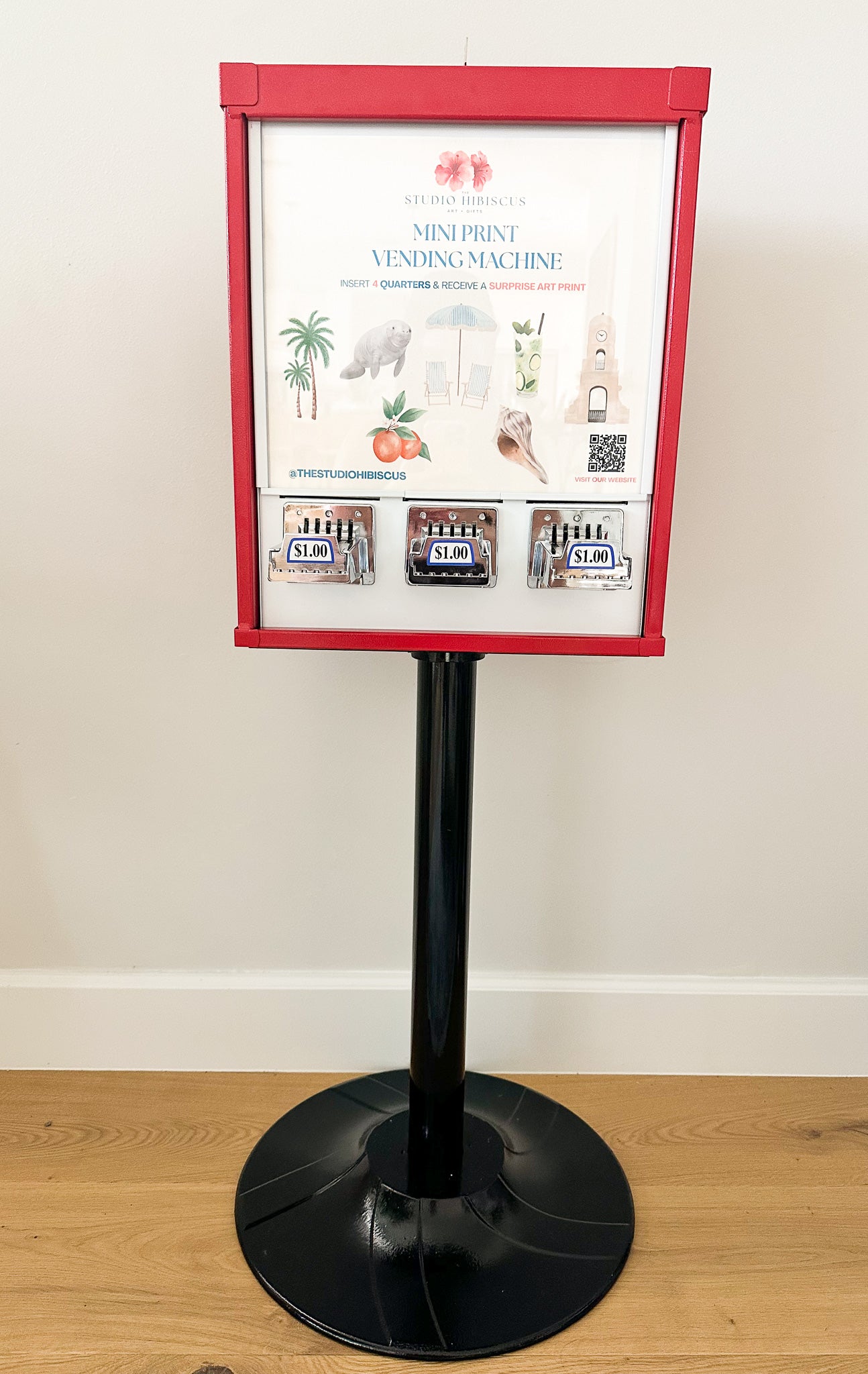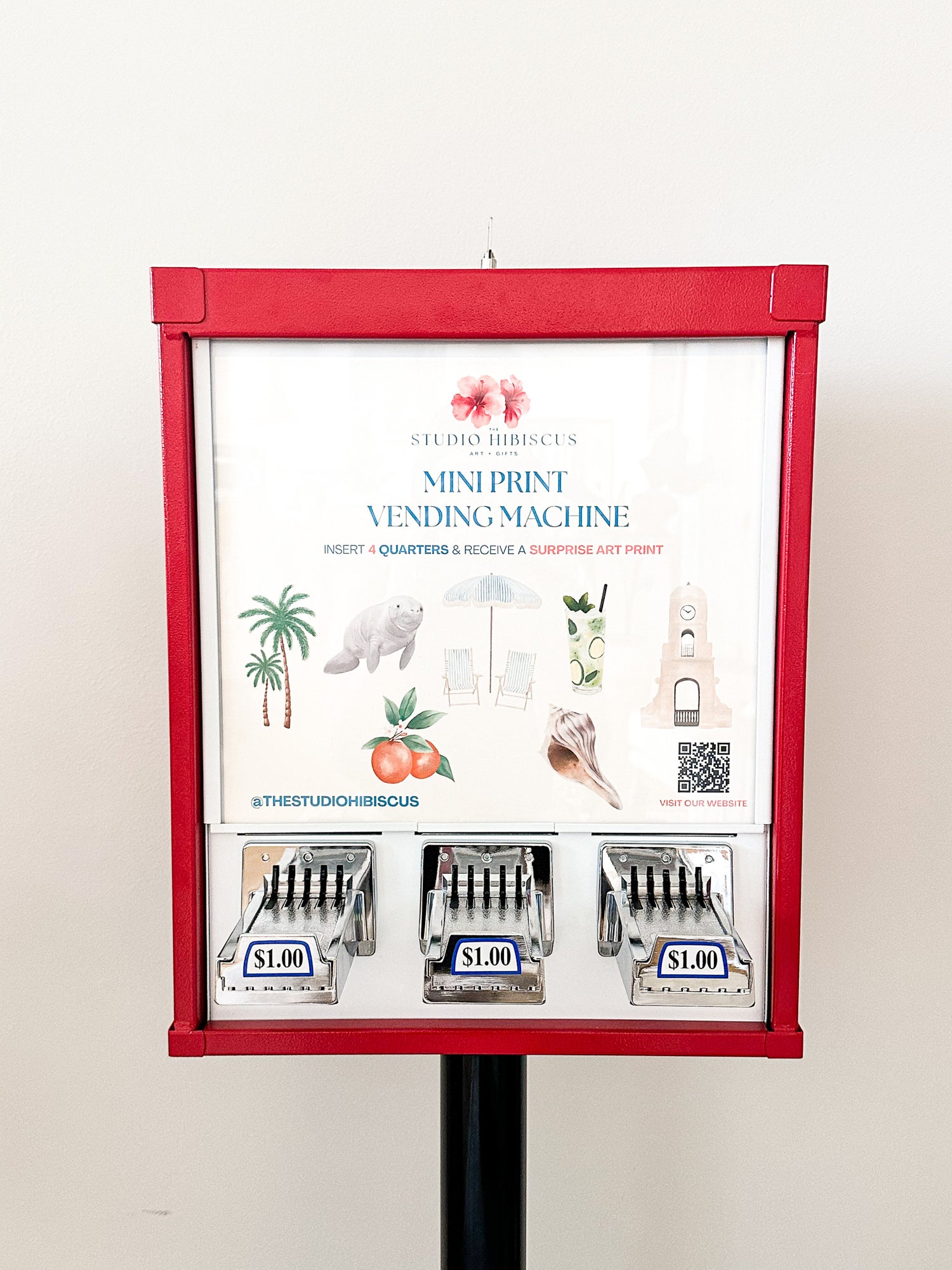 A mini print machine is a small vending machine that dispenses beautifully illustrated mini prints created by our studio.